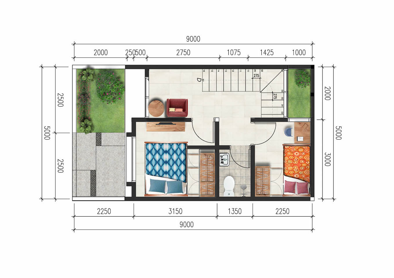 Tipe rumah yang saat ini telah dipasarkan adalah rumah 2 lantai dengan luas tanah 45 m2 dan luas bangunan 60 m2.
